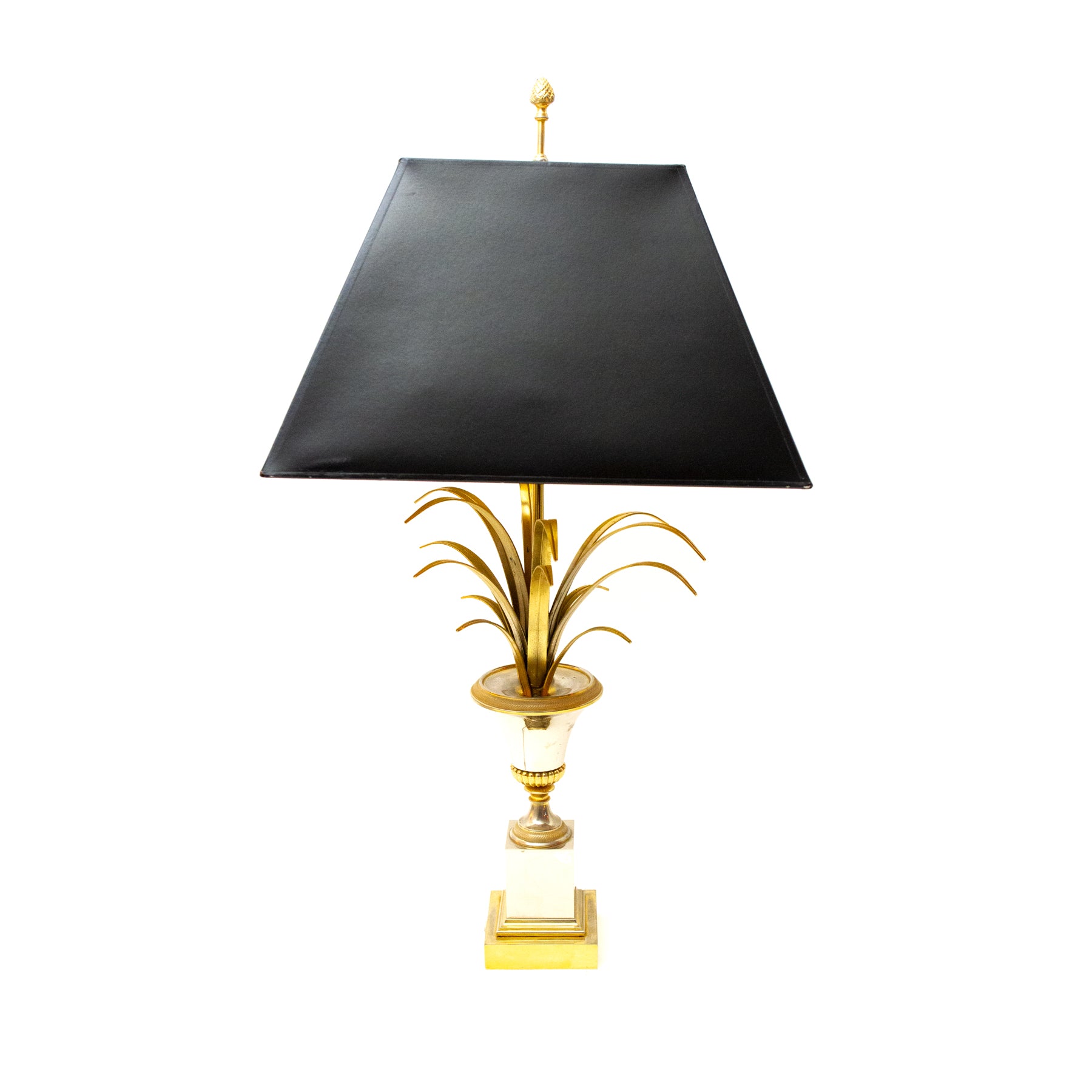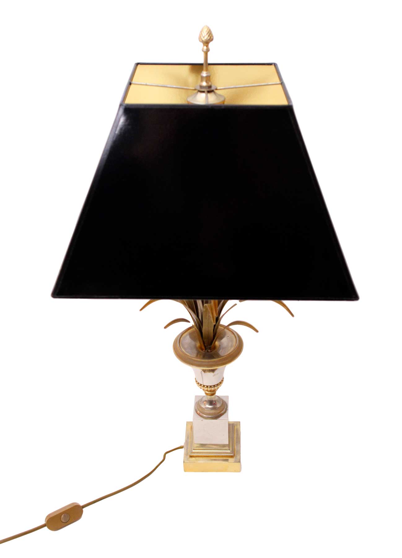 Brass palm tree table lamp with high-gloss black shade with minor damage.