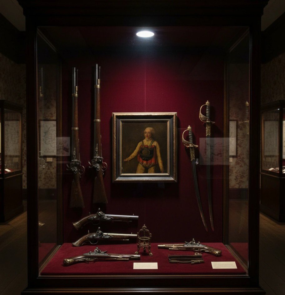 - Een merkwaardig portret van een schermmeester, gekleed in alle noodzakelijke beschermende kleding en uitrusting voor het schermen, in een tijd waarin deze activiteit zowel als sport als oorlog werd beschouwd.
