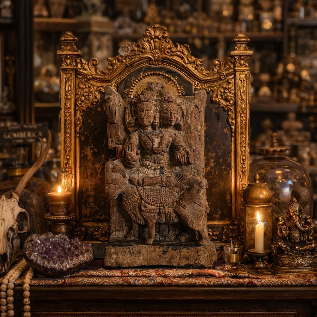 Dit is de god Agni, rijdend op een geit. Het is een houtsnijwerk uit de 18e/19e eeuw uit India, waarschijnlijk afkomstig van een processiewagen.